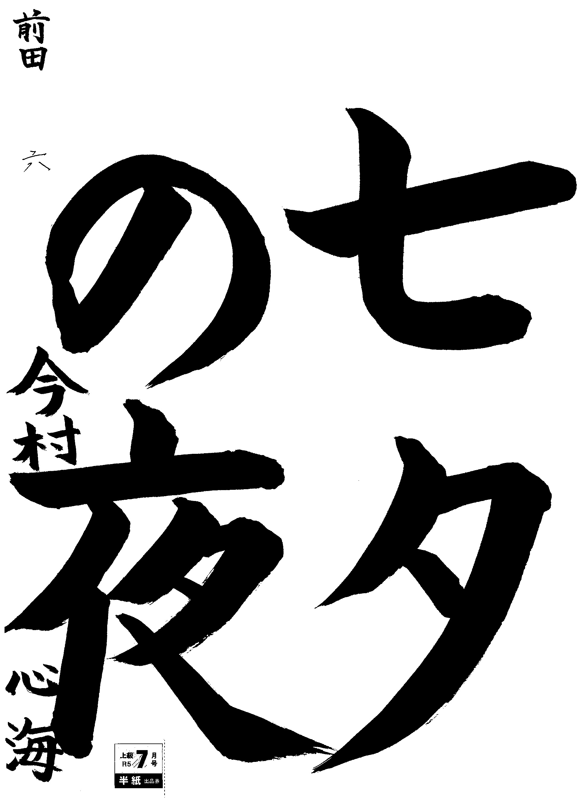| 前田 | 今村 心海 | 一点一画ていねいかつ伸びやかに書けています。特に払いは、群を抜いていました。 | |