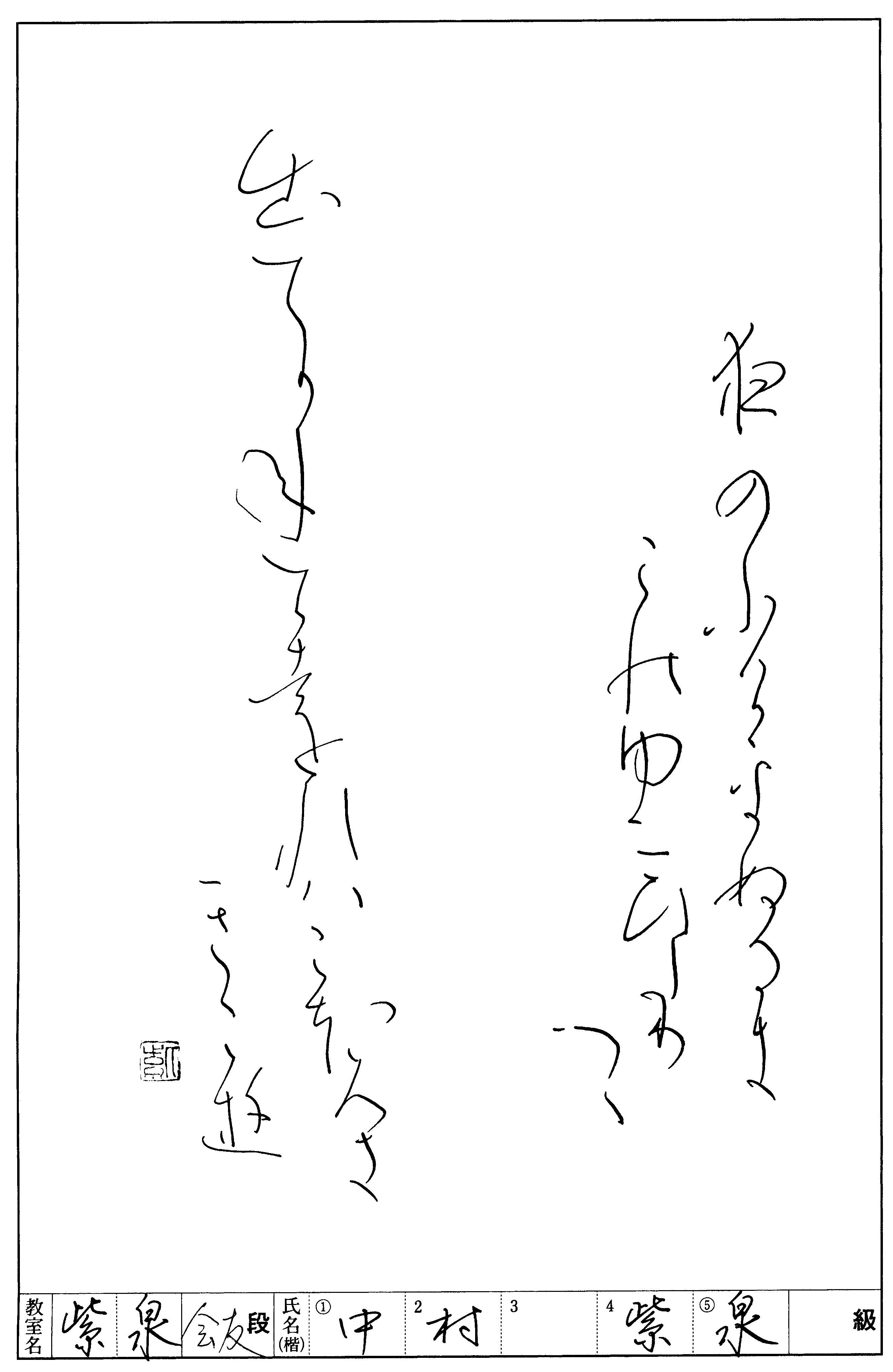 | 西宮 | 西 理美 | 中心がよく揃い横への流れが無理なく自然で美しい。安定感のある字形も見事である。 | |