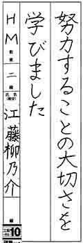 選ばれたのは、有馬先生のご指導のおかげだと思っています。これからも、先生のご指導に従ってもっときれいな字が書けるようにがんばりたいです。